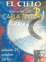 Volante. El Cielo. 1995. Este flyer promociona un evento en El Cielo el sábado 21 de octubre a las 24 hs, que presenta a Carla Tintoré.