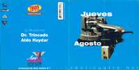 Volante. Ave Porco. Jueves Veinticuatro horas octubre. 1998 Portada azul para los eventos de "Jueves" en "Agosto", mostrando una imagen de una púa de tocadiscos, el logo de Tower Records y a los DJ Residents Dr. Trincado y Aldo Haydar.