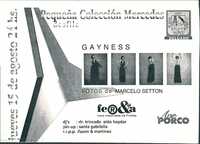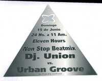 Volante. Ave Porco. Pequeña Colección Mercedes desfile. 1996 El reverso de una tarjeta en forma triangular y de color gris metálico, que detalla una "friendly confront" de "Eleven Hours Non Stop Beatmix" entre "Dj. Union vs. Urban Groove" el "Domingo 15 de Junio", desde las 24 Hs. hasta las 11 Am..