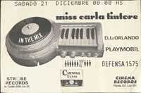 Volante. Defensa 1575. In the Mix Miss Carla Tintoré. 1996 Un evento llamado "IN THE MIX" con Miss Carla Tintoré, que tendrá lugar el sábado 21 de diciembre a las 00:00 hs en Defensa 1575 (hoy es la sala de conciertos Torquato Tasso). El DJ invitado es Orlando. El evento cuenta con el patrocinio de Corona Extra. También se mencionan Strobe Records (Av. Cabildo 2398. Loc: 20) y Cinema Records (Florida 537. Loc: 431). Se incluye una imagen de un Playmobil.