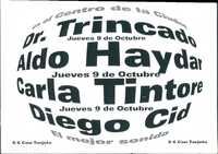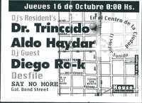 Volante. Ave Porco. 1997 El reverso de una promoción para el "Jueves 9 de Octubre", donde los nombres de los DJs Dr. Trincado, Aldo Haydar, Carla Tintore y Diego Cid se muestran con un efecto de distorsión, y se anuncia un costo de $6 Con Tarjeta