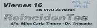 Volante. Ave Porco. ReincidenTes. Este archivo es el reverso de una tarjeta de invitación para un evento llamado "ReincidenTes" en Viernes 16, anunciado como "EN VIVO 24 Horas", con la participación de los DJ's Miss Carla Tintore y Dr. Trincado, y contiene una nota manuscrita que indica un costo de $5 para chicos y entrada sin cargo para chicas