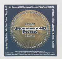 Volante. Parque Sarmiento. Underground Park cuadrado. 1997 Este documento es un folleto o afiche para un evento llamado "UNDERGROUND PARK" que tuvo lugar el 13 de diciembre de 1997 en Buenos Aires. El evento, que incluía la frase "Suspende por lluvia", ofrecía la venta de entradas anticipadas con descuento en varias galerías.