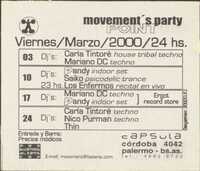 Volante. Cápsula. Movement's Party Point. 2000 Promociona los eventos "movement's party POINT" que se llevaron a cabo en marzo de 2000.