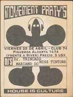 Volante. Club 74. Movement's Party Point. 1997 un evento llamado "MOVEMENT PARTY'S" que se llevará a cabo el viernes 25 de abril en el CLUB 74, ubicado en Figueroa Alcorta 7474 (frente a River). El precio de la entrada es de 5 U$S.