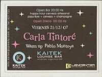 Volante. Kaitek Lounge Bar. Carla Tintoré. 2007 Este documento es un anuncio o flyer para el Kaitek Lounge Bar, promocionando un evento específico el viernes 21 de diciembre de 2007. Anuncia un "Open Bar" a las 20:00 hs con happy hour de cerveza artesanal, pizza libre, cerveza y champagne, seguido de un "Open Disco" a las 00:00 hs. El evento principal es una presentación de Carla Tintoré, con Pablo Montoya haciendo el "Warm up".