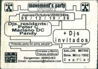Volante. Salón Mitre. Movements Party Point. 2000 Se promociona Movement's Party Point, un ciclo de fiestas los jueves de octubre de 2000 (05, 12, 19, 26) en el Salón Mitre (Bme. Mitre 1552). Los DJs residentes eran Peter C, Mariano DC y Pandy, y se destacaba que la entrada y la barra ofrecían "Precios módicos"