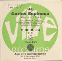 Volante. Age of Comunication. DJ Carlos Espinosa El flyer promociona el evento "Age of Communication" que se llevará a cabo el 1 y 2 de julio, presentando a Carlos Espinosa de Miami, U.S.A., quien es D.J., Remixer y Productor del sello Vibe Records, además de colaborador y distribuidor de Murk Records; el evento también contará con Home D.J's y es organizado por UNION RECORDS, teniendo lugar en M. T. de Alvear 405, Buenos Aires, con la actividad del 2 de julio iniciando a las 24 hs.