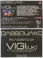 Volante. Cocoliche. Bassquake con vigi. 2004 Se observa la promoción de la fiesta BASSQUAKE el 20 de agosto de 2004 en Cocoliche, destacando la presencia del DJ y productor británico VIGI (UK) de sellos como Marine Parade y TCR, en el marco del lanzamiento del sitio web BABREAKS.COM
