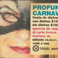 - Este documento es un anuncio para una fiesta de disfraces llamada "PROFUNDO CARNAVAL 4". La fiesta se realizó el sábado 24 de febrero de 2001, desde las 12 PM hasta las 6 AM. La entrada costaba $10 con disfraz y $100 sin disfraz. Los DJs del evento fueron Carla Tintoré, quien tuvo un "HAPPY BIRTHDAY SET", y Mariano DC.