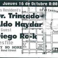 - Frente de una tarjeta para el "Jueves 11 de Diciembre" en Ave Porco Corrientes 1980, que presenta una gran esfera central de tonos verdes y amarillos y lista a los DJs Dr. Trincado, Aldo Haydar (Residents) y Miss Carla Tintore (Guest)